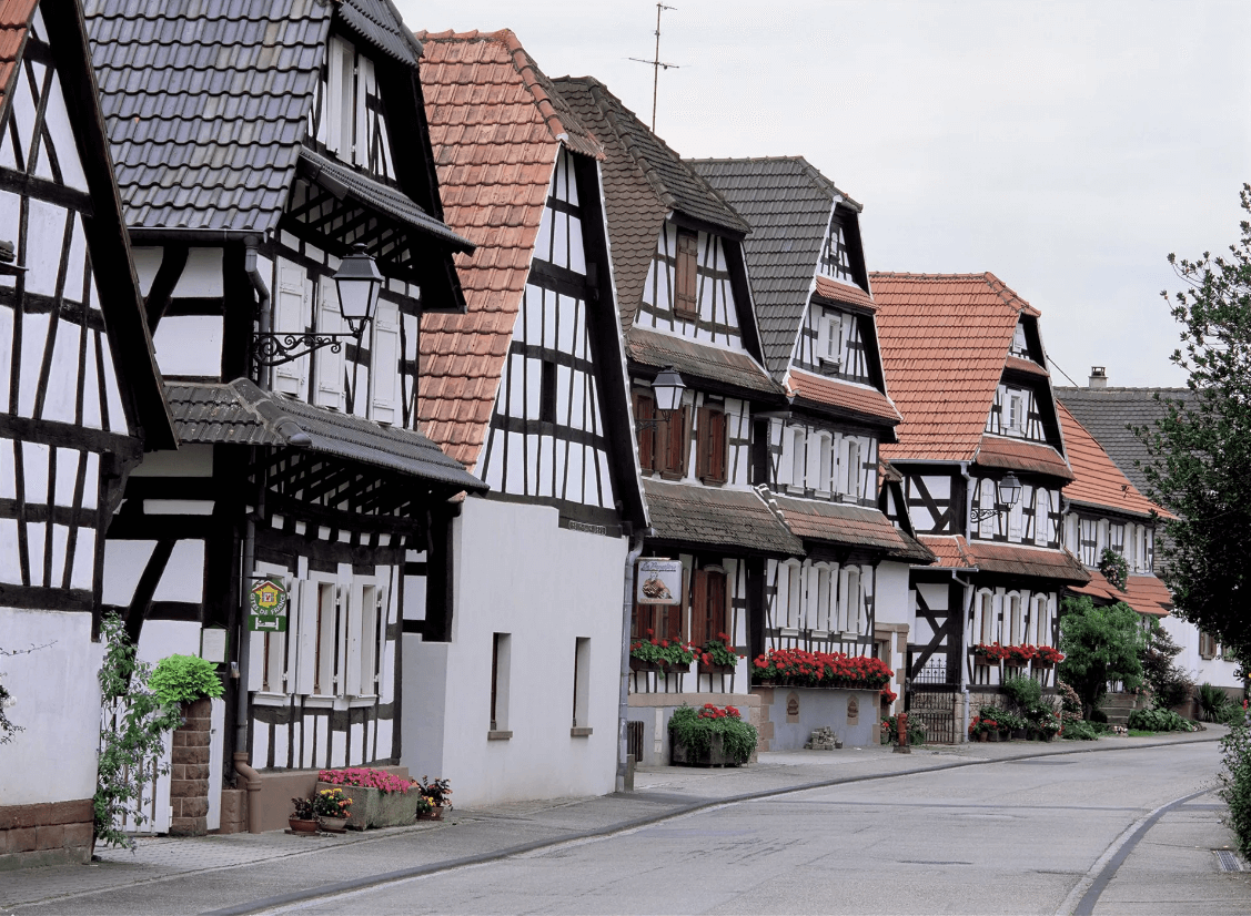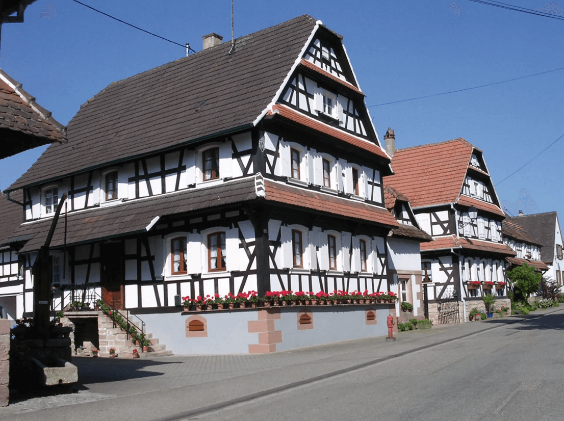 亨斯巴赫位于北部孚日地区自然公园(Vosges du Nord Regional Nature Park)的东端,是外福尔地区(Outre-Forêt)的一个典型村庄。从某种意义上说,农业是这个村庄的基础活动。三十年战争结束时,亨斯巴赫几乎一贫如洗,幸亏一些法国难民和瑞士移民以极少的钱获得了土地,才得以生存下来。他们利用当地的资源--附近哈格瑙森林中的粘土和木材--建造了与家乡相似的房屋。时至今日,亨斯巴赫及其居民仍靠天吃饭,保持着典型的居住方式。村子由许多农舍组成,这些农舍围绕着一个庭院,庭院向街道敞开,可以俯瞰周围的果园和田野(与阿尔萨斯其他地区不同,阿尔萨斯的庭院被高墙包围)。在寺庙粉色砂岩钟楼的脚下,18 和 19 世纪的半木结构房屋与 “破鼻子 ”屋顶相映成趣。天气晴朗时,村子里的花坛和窗台上盛开着五颜六色的天竺葵。